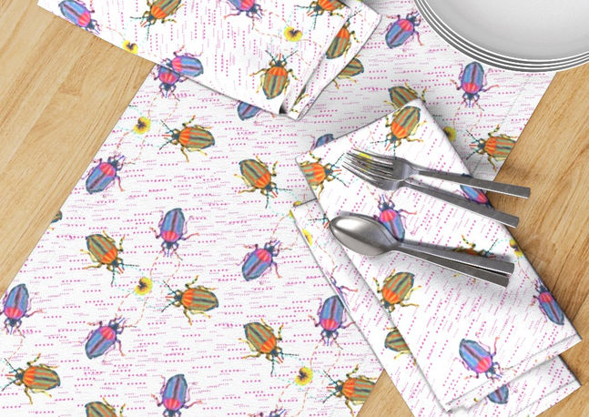 A colorful entomological ballet of bugs in red, green, pink and lilac blue - all colors of the rainbow! - circling around insect grubs.