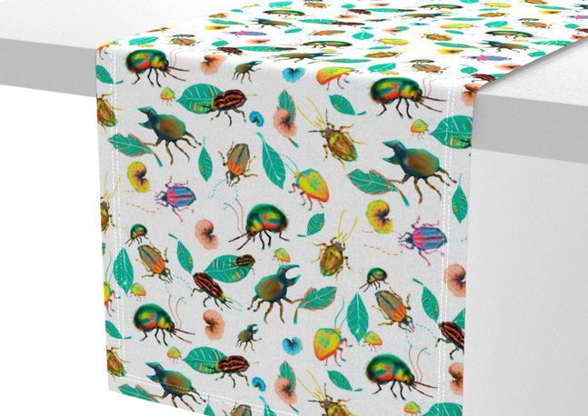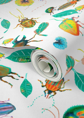 Colorful, iridescent bugs are bustling in neon colors on a light white background. A Statement piece in the making on home decor and apparel alike!