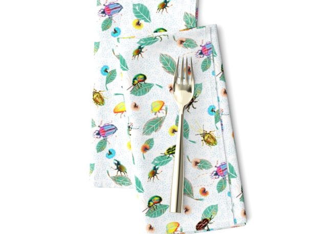 Colorful, iridescent bugs are bustling in neon colors on a pristine white background structured by blue clustered dots. A Statement piece in the making on home decor and apparel alike!