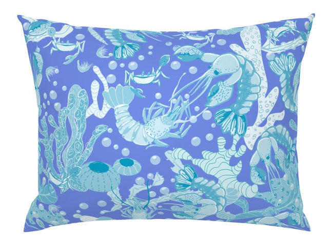 This whimsical, hand-drawn composition draws you into a lively underwater ecosystem filled with crustaceans like lobsters, crabs, and shrimp dancing amidst corals, kelp and seaweed, surrounded by bubbles in periwinkle teal.