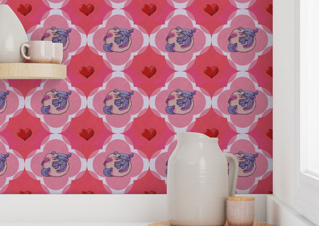 Sweet light pink and lilac axolotls embrace and kiss on a backdrop of pink and blush quatrefoil shapes and red hearts in this Valentine's Day design!