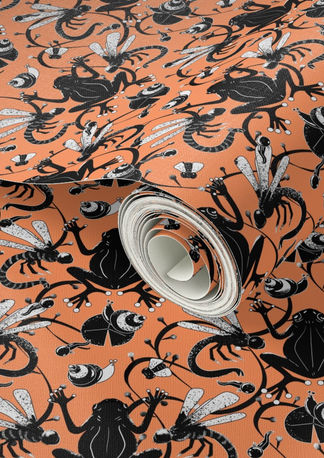 This spooky diamond pattern of frogs and dragonflies teems with life through dynamic art nouveau lines in velvety black and fiery tangerine orange. Its fluidly drawn animals in an abstract pond environment are as quirky as they are elegant. Perfect if you are not afraid of wet amphibians and insects!