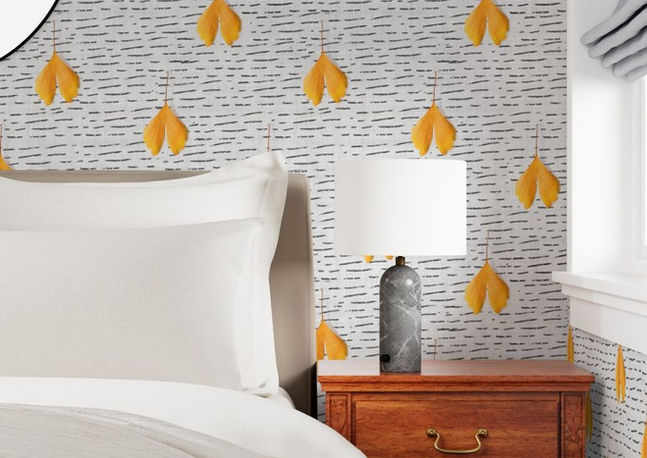 This elegant minimalist organic composition features serene fan-shaped ginkgo leaves laid out, delicately arranged on faux-linen texture to show off nature's calm beauty in a palette of golden orange on light gray with dashed charcoal stripes.