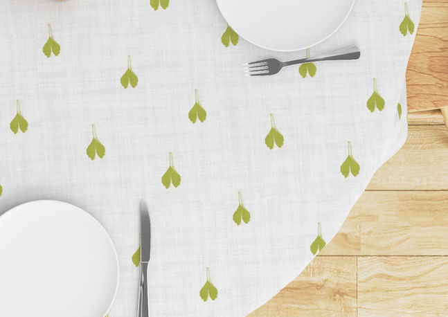 This elegant minimalist organic composition features serene fan-shaped ginkgo leaves falling, delicately arranged on faux-linen texture to show off nature's calm beauty in muted chartreuse green contrasting against a muted off-white.