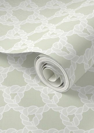 This fishernet composition of intricately braided, looped ropes forming interconnected knots creates a textured, geometric lattice with strong nautical vibe in soft sage green and crisp white.