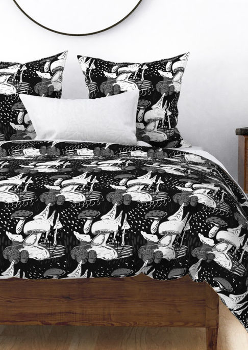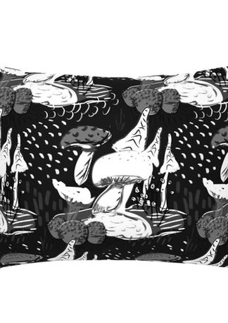 This intricate botanical features stylized mushrooms interspersed with abstract, organic textures and dynamic artistic brushstrokes creating a feeling of woodland whimsy in striking black, white and gray.