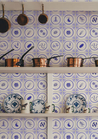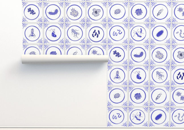 This fun modern twist on classic Delftware old dutch tiles swaps bucolic scenes for hand-drawn marvelous microbes in a historical folklore pottery style! Don't worry, banned to durable and water resistant novelty vinyl wallpaper, these little nasties will stay put in pictures in your otherwise spotless kitchen space.