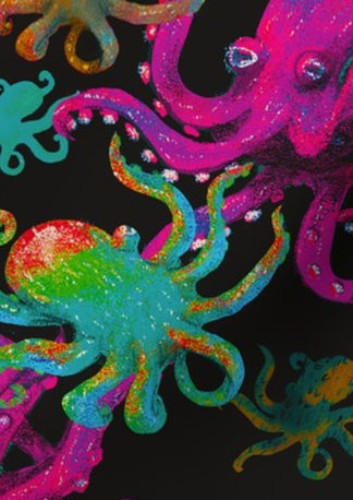 A fun deep sea scene teeming with grappling little octopuses in pink yellow and cyan hues before a dark deep sea background.