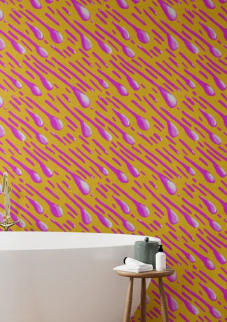 Serene, abstract rainfall motif with stylized hot pink raindrops and elongated streaks cascading vertically across a vibrant golden yellow textured ground. Its trippy dynamic and bold palette scream 70s flowerchild aesthetics.