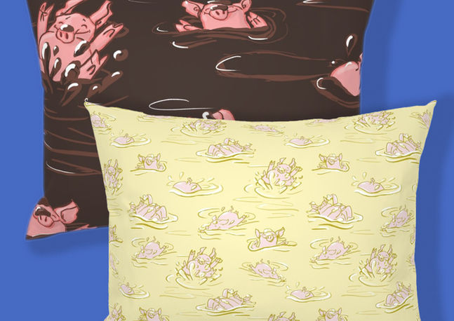 Cute pink pigs all around in nursery & home decor! This design originated in a challenge prompt by Spoonflower and Eastfork Pottery with a fixed palette I normally wouldn't work with: Piglet Pink and Butter Yellow! Hearing this, I couldn't stop seeing those piglets having fun in a sea of rich creamy butter. So that's what I drew and the rest is history. Butts up!