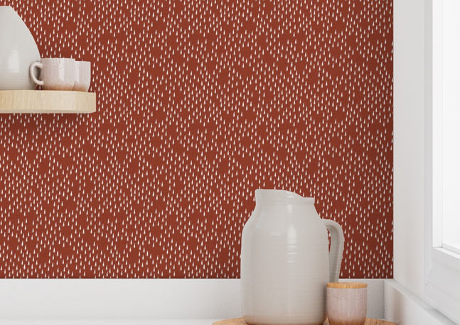 This boho japandi blender shows white raindrops placed loosely in a net structure with irregular holes on dark rust red adding movement and interest.