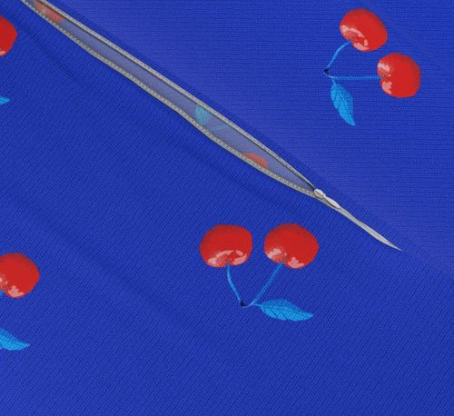 This charming retro design features pairs of sweet cherries on a vibrant, textured faux-knit blue, perfect for coquette farmhouse kitchen vibes!