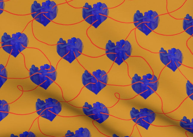 Being human is being connected! A group of stylized, abstract people in vibrant blue forming a heart shape, interconnected via red lifelines. Hero pattern of my ""The Connected"" Collection.