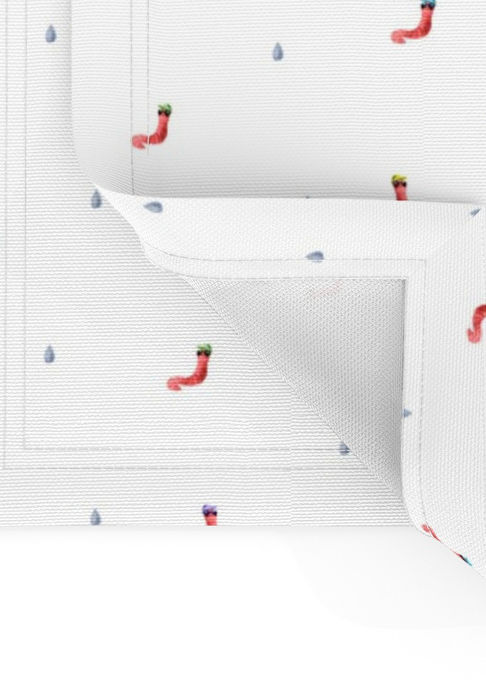 composition featuring funny worm characters sporting sunglasses and headwear. The motifs are scattered across a plain white backdrop with muted gray blue raindrop shapes.